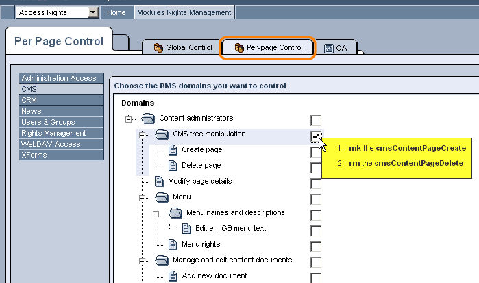 For instance, if "CMS Tree Manipulation" and "Publish en_US documents" have been selected within the "Access Rights" module, in the "Rights" tab you will be able to specify which groups have the right to manipulate the CMS tree (by creating and deleting pages) and which groups have the right to publish documents in English.