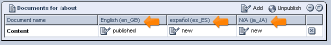 A single web page can be created in multiple languages by making a different document for each different language. The available languages for the page can be viewed in the "Documents for..." table of the "Content" tab, and are determined by which languages have been installed for your particular website.