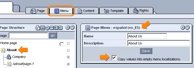 If your site uses more than one language, the check box "Copy values into empty menu localizations" will appear in the Menu tab.