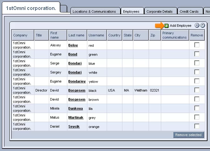 Employee Professional:Upon selecting an employee from the company's listing, you will be presented with the employee's professional profile. The tabs included within this section are pretty much the same as those included within the Contacts tab, including Locations & Communications, Credit Cards, Notes, and Login Settings. The only difference is that there is now a tab labeled "Work Details," in place of the "Personal Details" and "Family Members" tabs, displaying only information that relates to the contact as an employee of the company in question, as indicated by the office building icon in the upper-left hand corner of the screen and the company name in the drop-down menu next to the name of the employee. In order to access the personal contact details of the employee, simply click on the icon depicting two faces to the right of the company name (as indicated in the picture below).