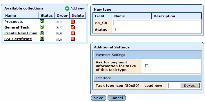 Once you have finished specifying settings for the new task type, click on "Save" and it will be added to the system.