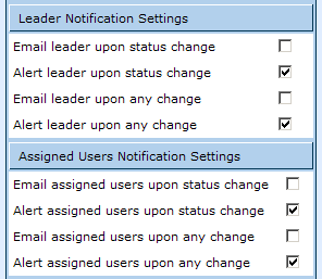 You can also set default "Leader Notification Settings," "Assigned Users Notification Settings," "Default Visibility For Notes," and "Default Visibility for Files." Unless you specify otherwise when creating individual projects, the settings specified here will be used to determine when leaders and assigned users are notified about specific changes to tasks and to control access to notes and files that are attached to tasks' profiles.
