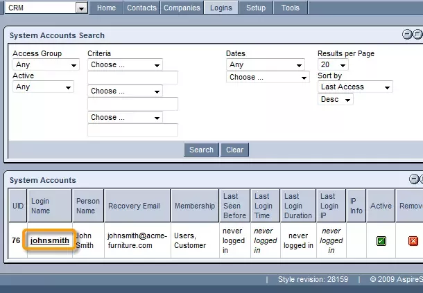 CRM LoginsDocumentation Tab will take you to list of all users You can click on a contact's login name to view details. Read more about individual contact settings in "Contact" documentation. |
