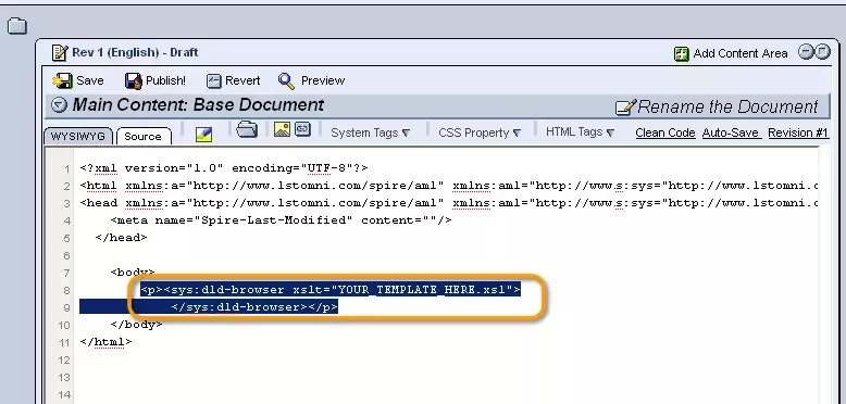 Once you have the "Source" editor window open, place your cursor in the location on the page where you would like your list of files to appear, and enter the following tag: <sys:dld-browser xslt="YOUR_TEMPLATE_HERE.xsl">