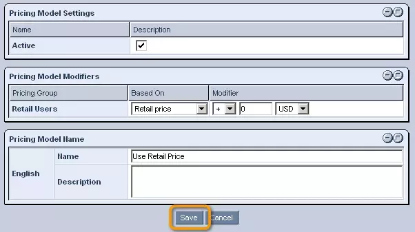 In the window that appears, enter an appropriate name and description for the model, click "Save," and it will be added to the "Pricing Models" table. In order to specify how the pricing for individual groups should be determined within this model, click on the