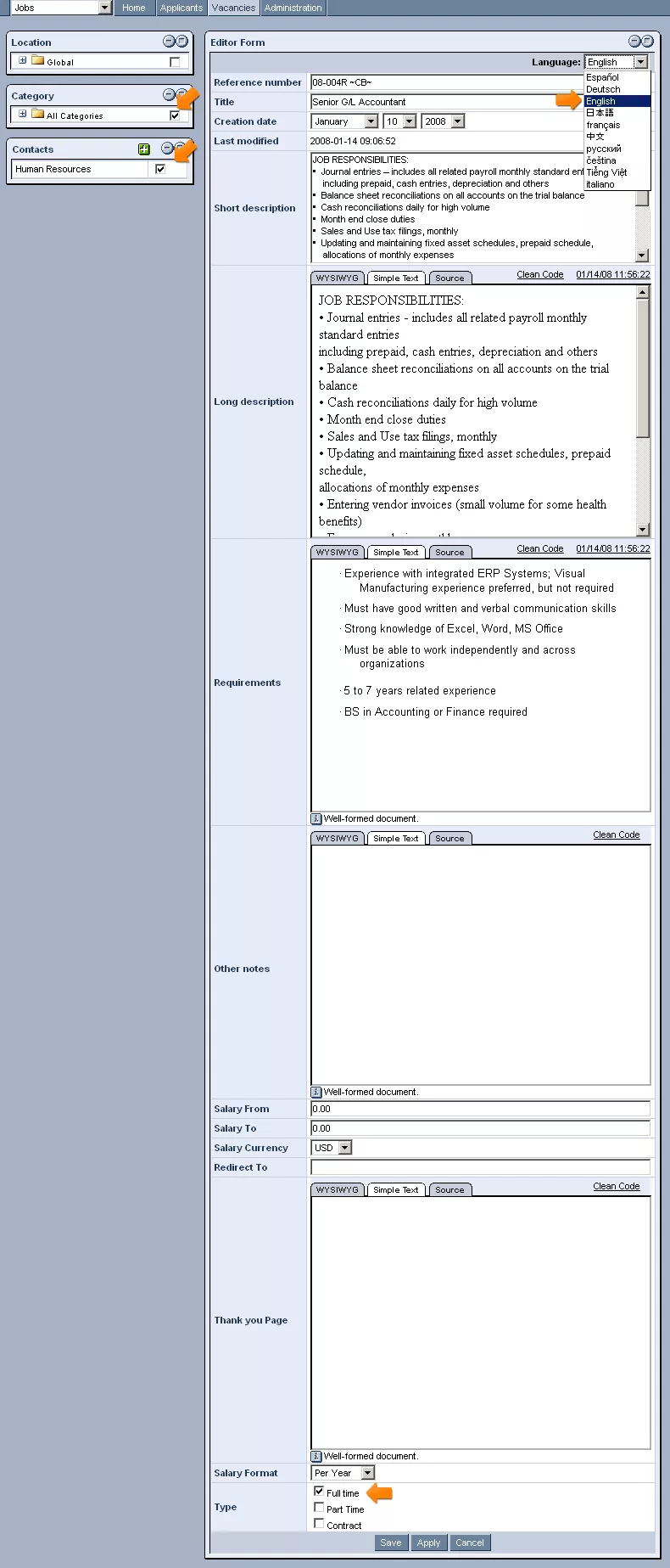 Title: This field allows you to enter a descriptive title for the job opening in each of the languages that your site supports. This is what the vacancy will be listed under when displayed on your site.